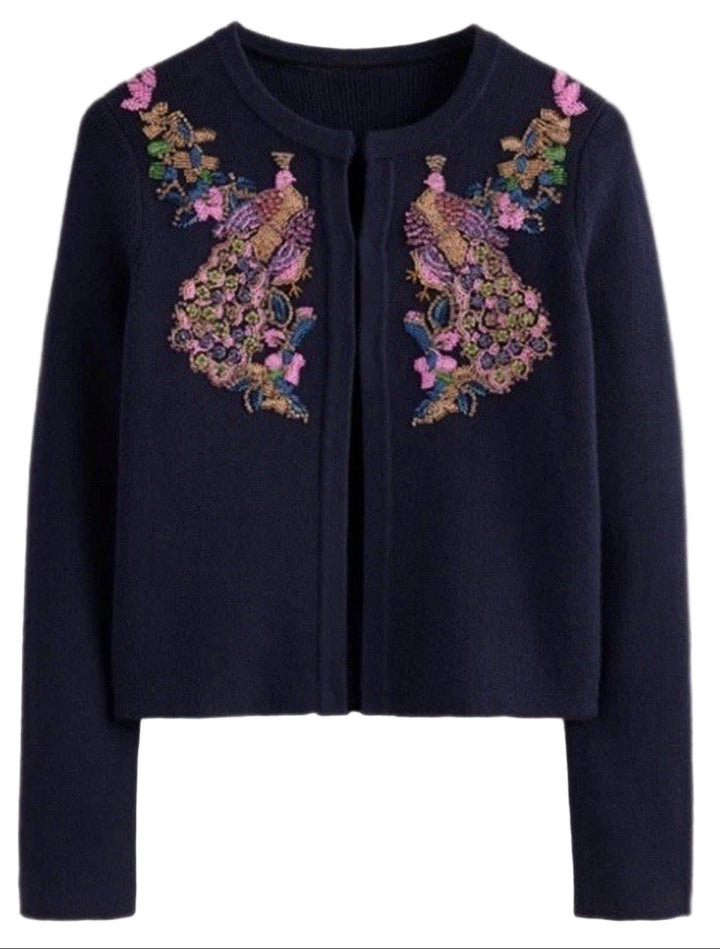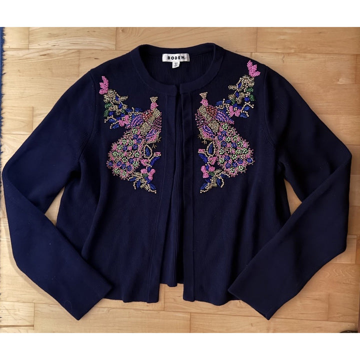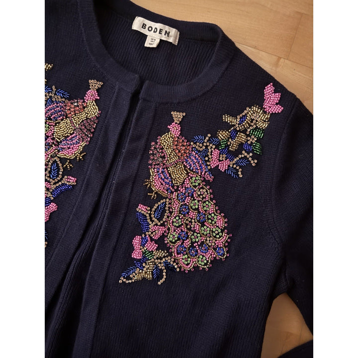 Boden Women’s Peacock Bird Embroidered Beaded Sweater Jacket Cardigan – Size 8