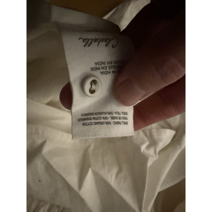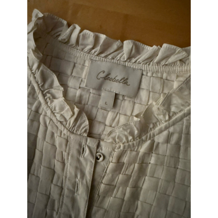 Elevate your wardrobe with the Cleobella White Ruffle Vivienne Blouse in size Large. Featuring delicate ruffle detailing on the neckline, this blouse exudes feminine elegance and sophistication. Its crisp white color makes it versatile for pairing with skirts, trousers, or jeans for both casual and dressy occasions. Crafted for a flattering fit, it’s perfect for everyday wear or special events. A timeless wardrobe staple, this blouse adds chic style to any outfit. Add this Cleobella blouse to your collection today and enjoy effortless, elegant fashion!