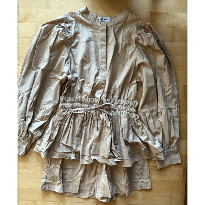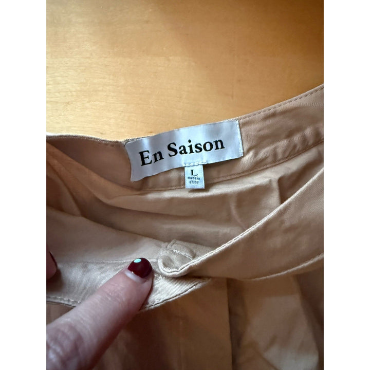 Stylish En Saison Sandrine romper in tan khaki, size Large. Features elegant ruffle details and a flattering fit. Perfect for casual days or dressy occasions, offering comfort and modern chic style.