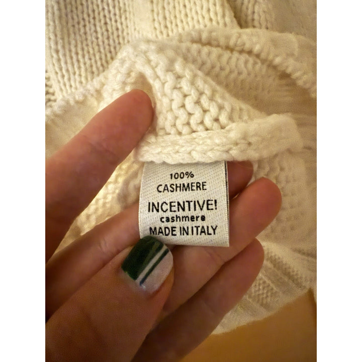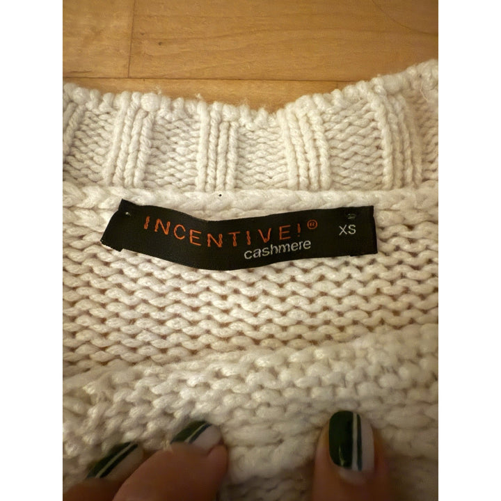 Wrap yourself in cozy luxury with this Incentive! Cashmere White Cableknit Chunky Sweater in size XS. Crafted from ultra-soft, high-quality cashmere, this timeless pullover features a classic crew neckline, long sleeves, and a rich cable-knit texture that exudes effortless elegance.