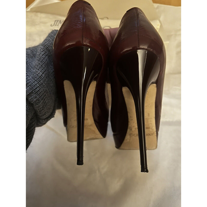 Elevate your style with these luxurious Jimmy Choo Cosmic Pumps, crafted from genuine eel skin leather in a rich burgundy wine hue. Featuring an ultra-high stiletto heel (over 4"), these pumps exude sophistication and glamour, perfect for evening wear, events, or adding a bold statement to any outfit.