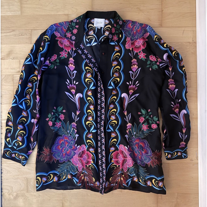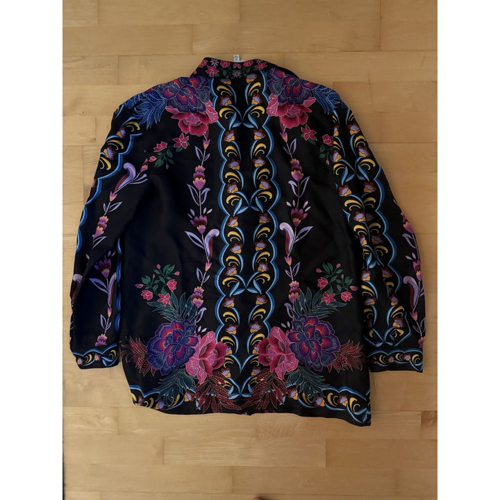 Elevate your everyday style with the Johnny Was Rosalynda Button Down Shirt, a standout piece in a luxurious silk blend. Designed in size XS, this blouse features a vibrant floral print set against a sleek black backdrop, blending bohemian artistry with timeless sophistication.