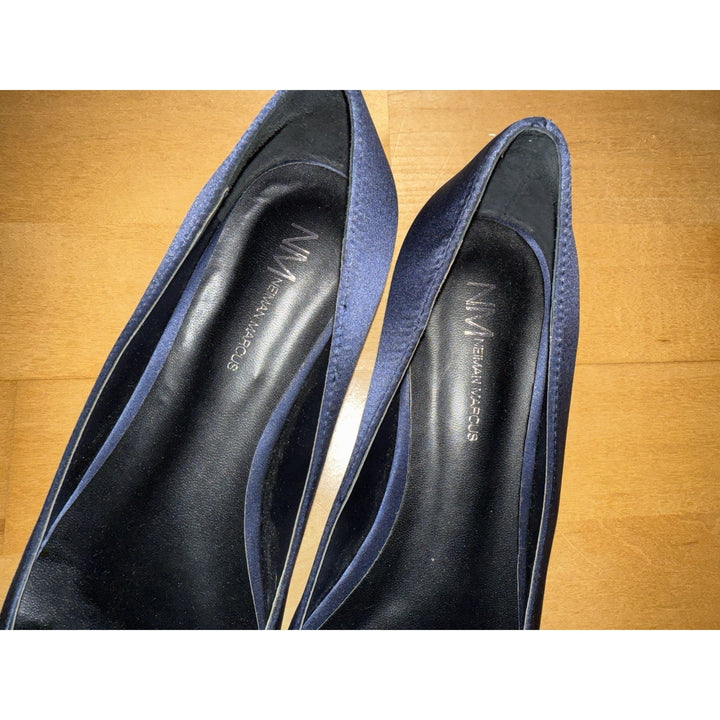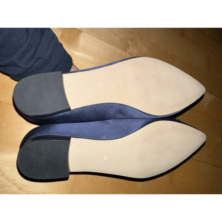NEW Neiman Marcus Women’s Navy Blue Satin Point Flats Silver Crystal Size 8.5