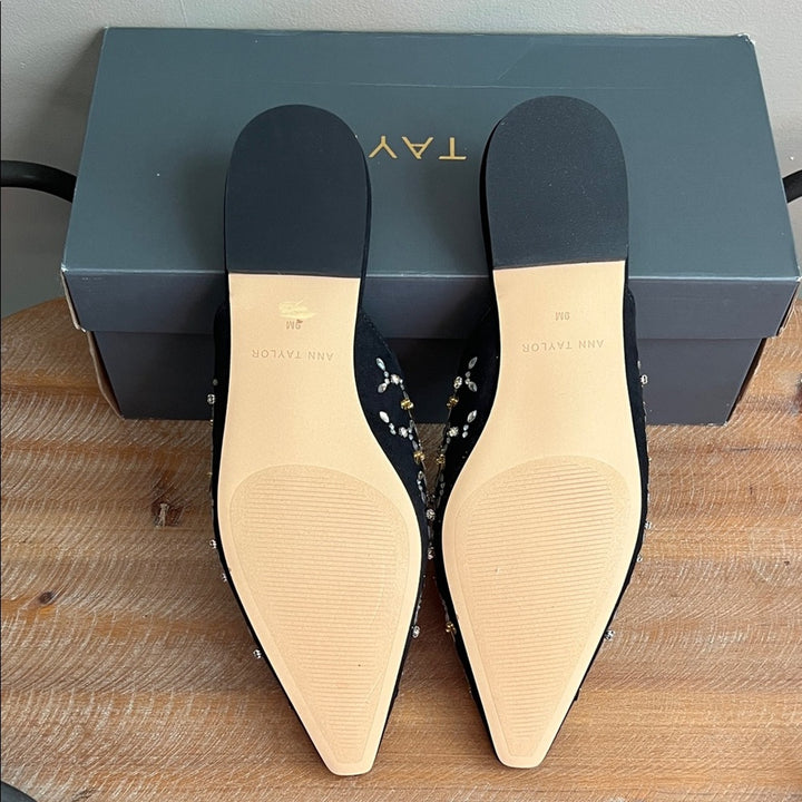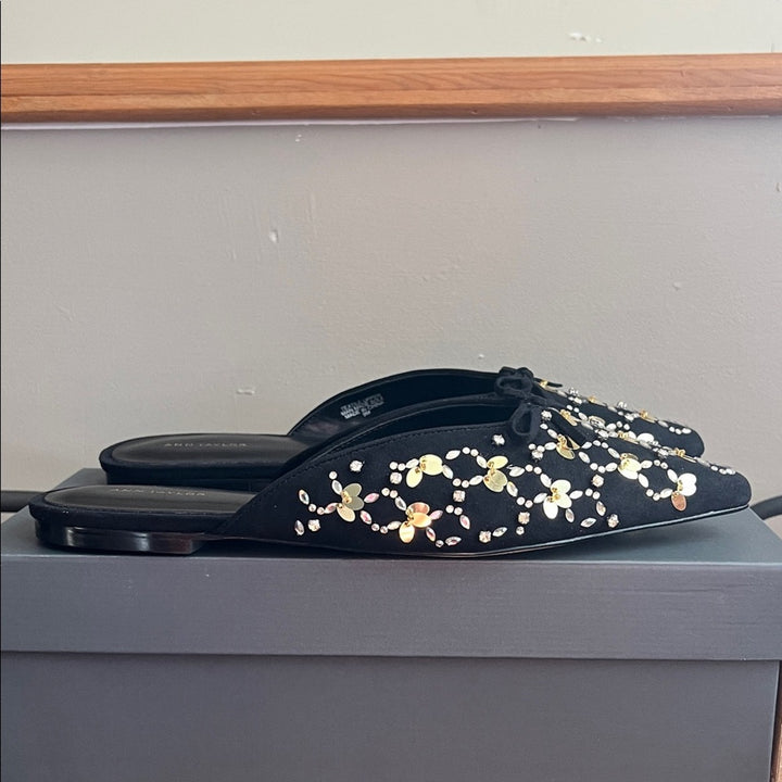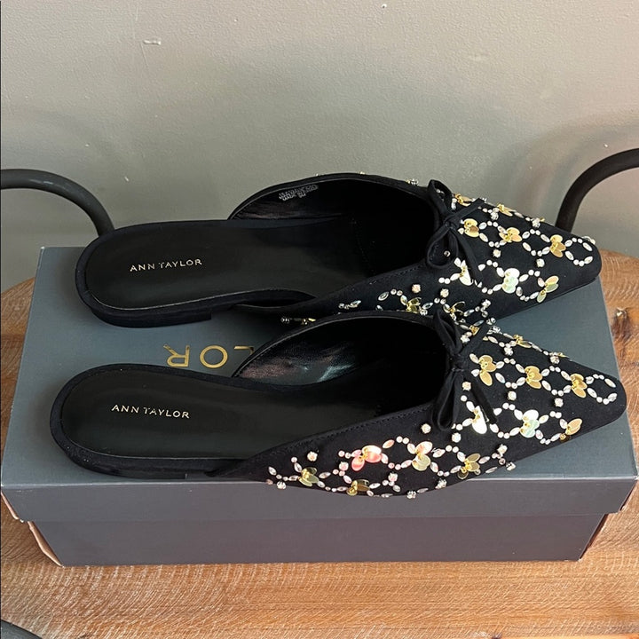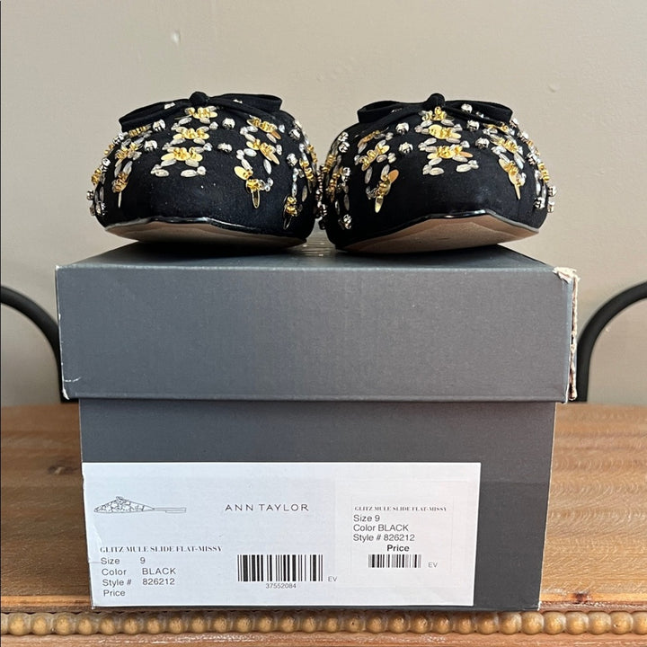 NIB Ann Taylor Black Flats – Beaded Mules with Gold & Silver Embellishments
