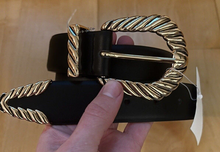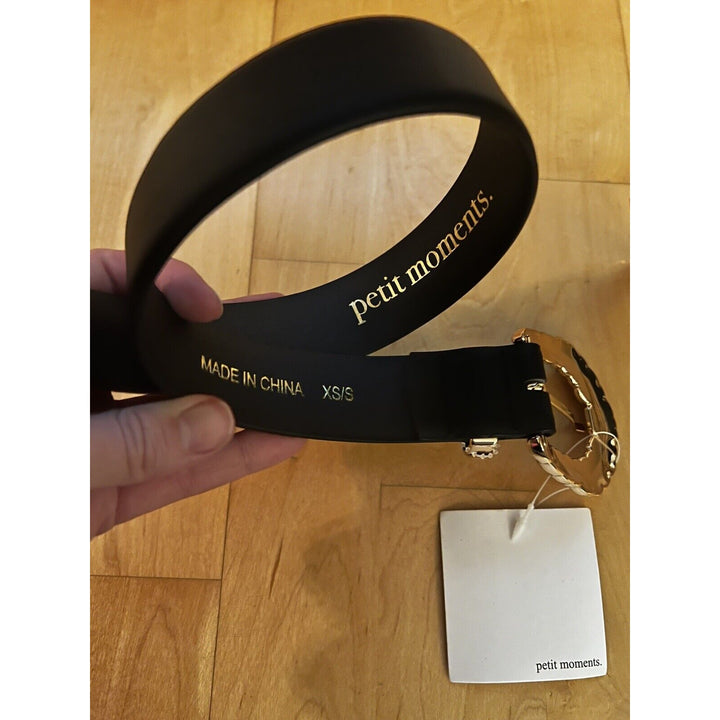 NWOT Petite Moments Black Leather Western Belt in size XS/S. This genuine leather belt features a sleek black design with gold-plated hardware and a western-inspired buckle. The medium-width silhouette makes it a stylish and versatile accessory for both casual and dressy outfits.