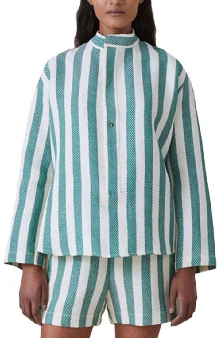 Add effortless chic to your wardrobe with this striped green Pop-Over Shirt by Attersee. This oversized blouse in size M/L is perfect for layering or wearing solo. Its breathable fabric and classic stripes make it a staple piece for work or weekend wear.