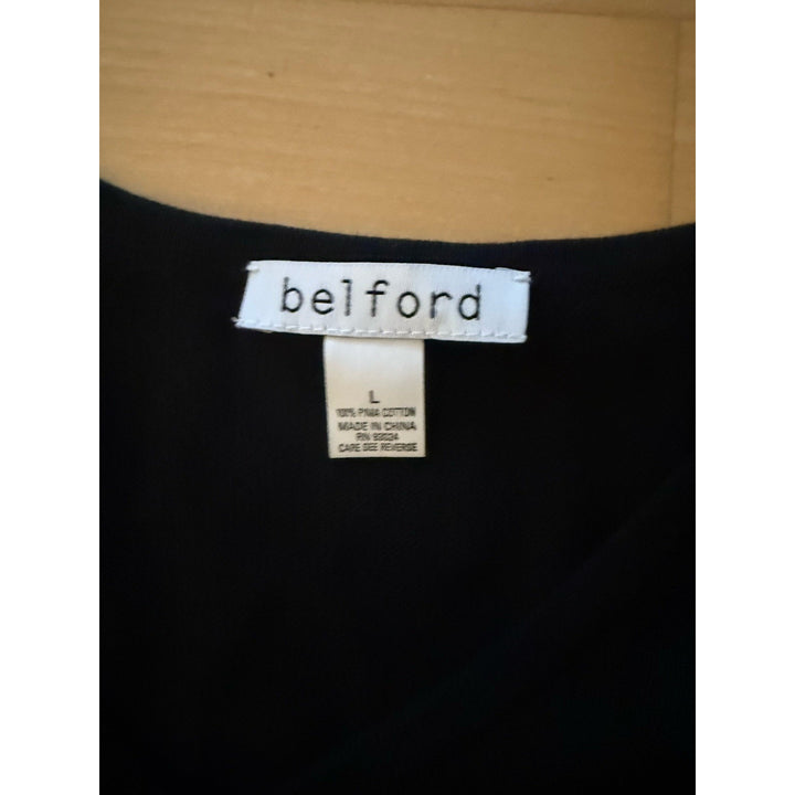 Elevate your everyday style with this New With Tags Belford V-Neck Top, crafted from luxuriously soft Pima cotton. In classic black, this versatile blouse features delicate crochet trim detailing that adds a subtle feminine charm. The flattering V-neckline and relaxed silhouette ensure both comfort and elegance, making it an easy choice for work, casual outings, or evening wear.
