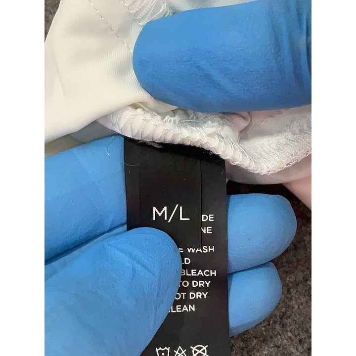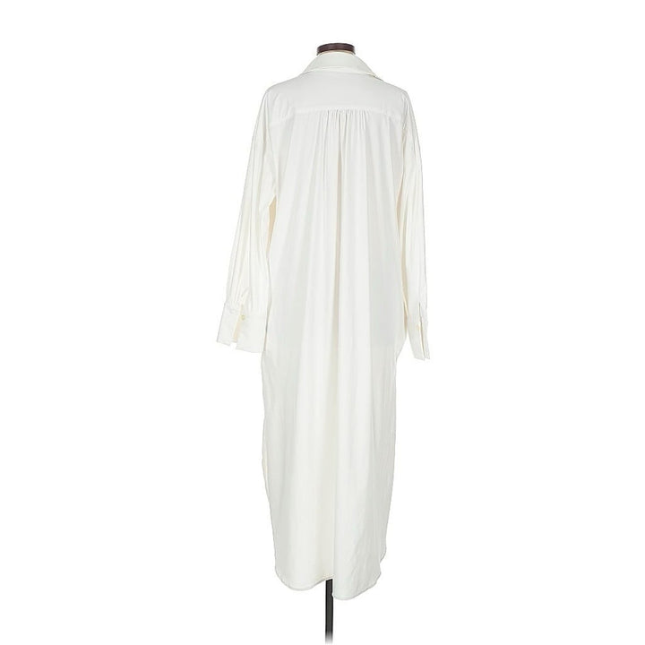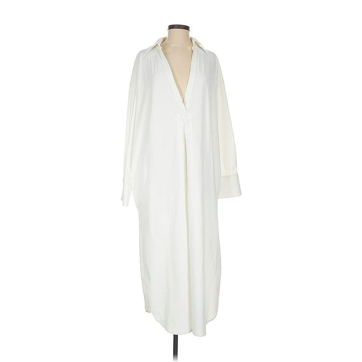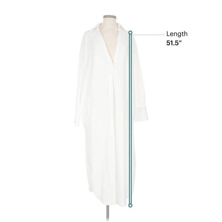 Modern and chic, the ONA 'Tropez II' shirt dress is a versatile standout. With a plunging V-neck, long sleeves, and a relaxed oversized silhouette, this white dress is perfect for everything from cocktails to resort wear. Made from a soft stretch polyamide blend in size M/L.