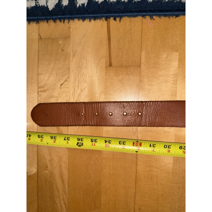The Ralph Lauren Tan Brown Cognac Brass Concho Square Western Equestrian Belt is a stylish and versatile accessory for women. Made of leather with a Western belt style, this belt in size M features a brown color with a square concho design, adding a touch of equestrian theme to any outfit. The brand's reputation for quality and classic style is reflected in this timeless piece that can elevate any look with its sophisticated charm.
