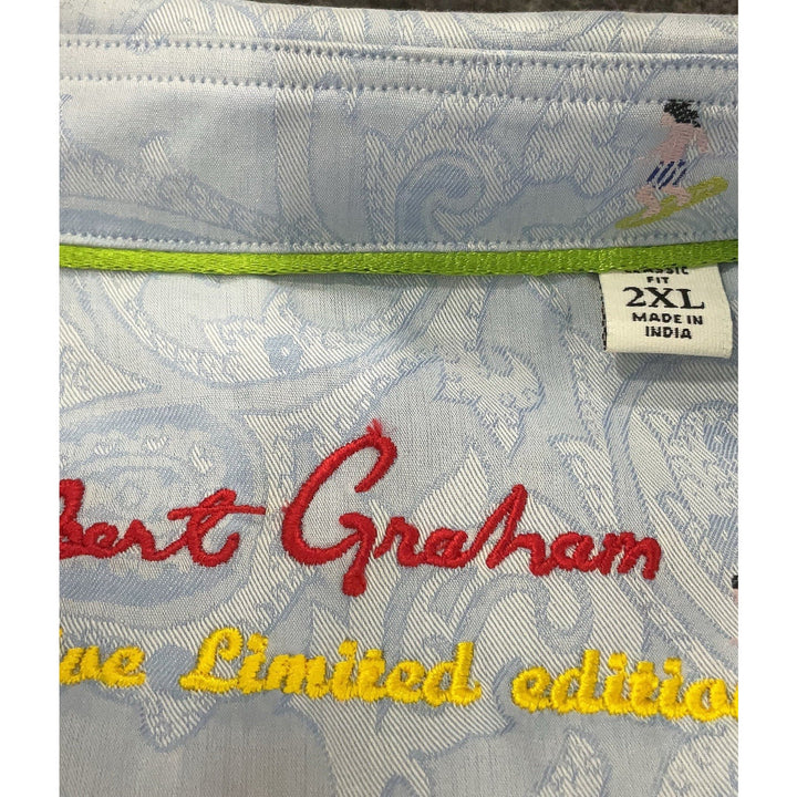 Make waves in this Robert Graham Limited Edition button-down. Crafted in a vivid blue surfer print, this long sleeve shirt features a tailored fit with signature artistic flair. Size 2XL. An eye-catching piece for bold wardrobes—perfect for laid-back events or standout streetwear.