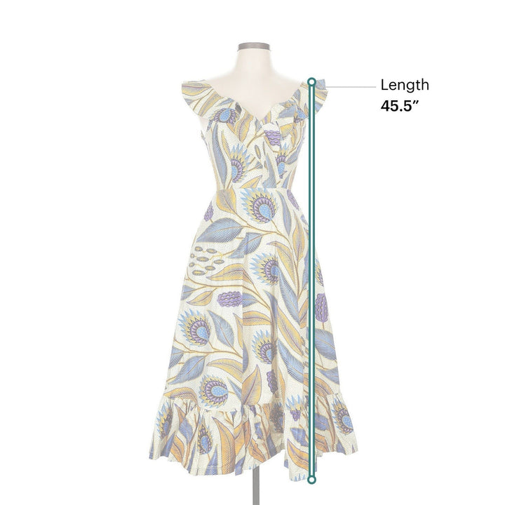 Effortlessly feminine, this SIKA midi dress in blue and tan is a standout piece made from 100% breathable cotton. Size UK 10 / US 6. Features a soft floral and leaf block print, sleeveless cut, and cascading ruffle detailing. The A-line silhouette and midi length make it perfect for garden parties, brunches, or summer strolls. Ethically made with artisanal craftsmanship—style with strappy sandals for a fresh, elegant look.