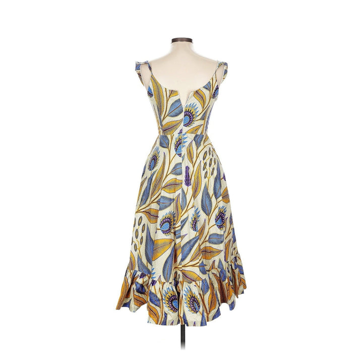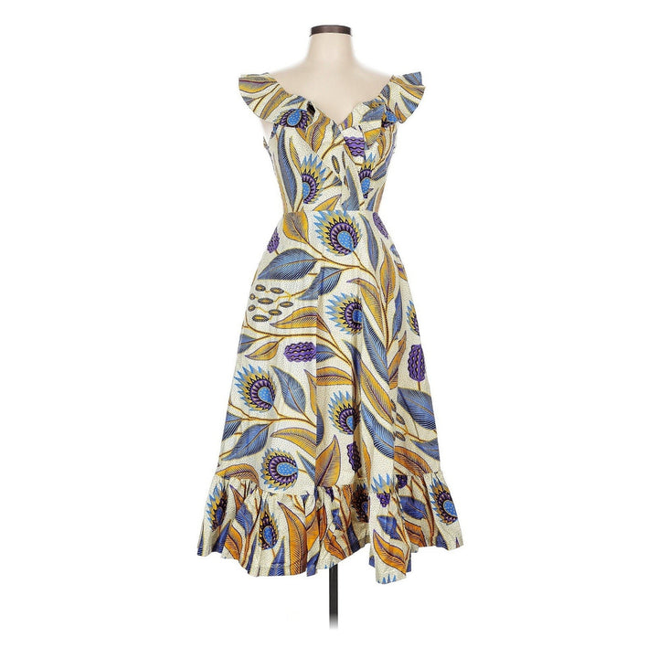 SIKA Women's Blue Tan Floral Leaf Print Ruffle Midi Dress – UK 10 / US 6