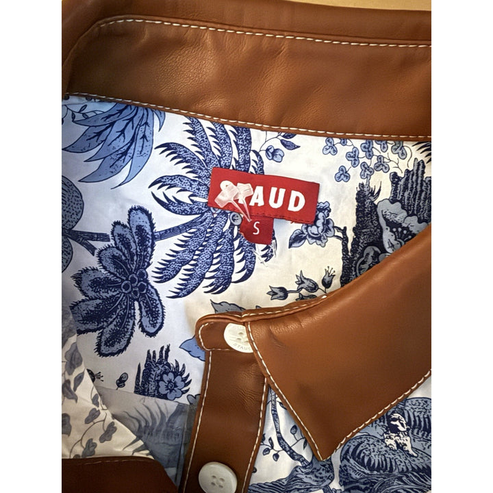Staud Women’s Mini Shirt Dress – Blue Toile Print & Cognac Faux Leather Collar Size Small
