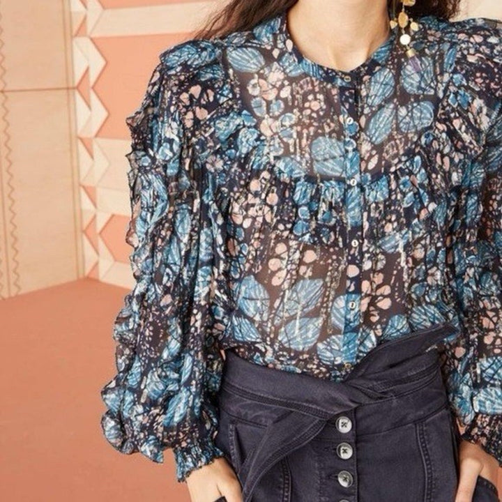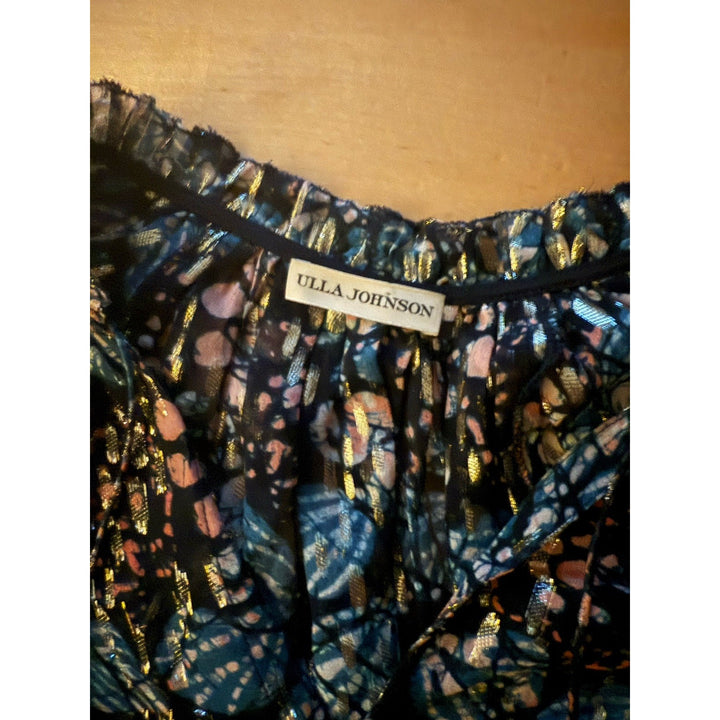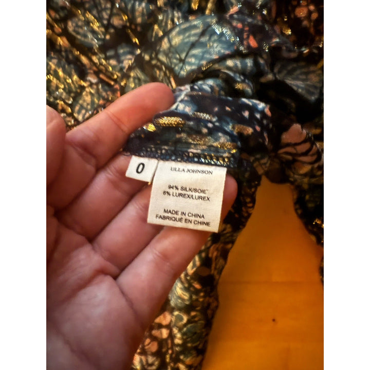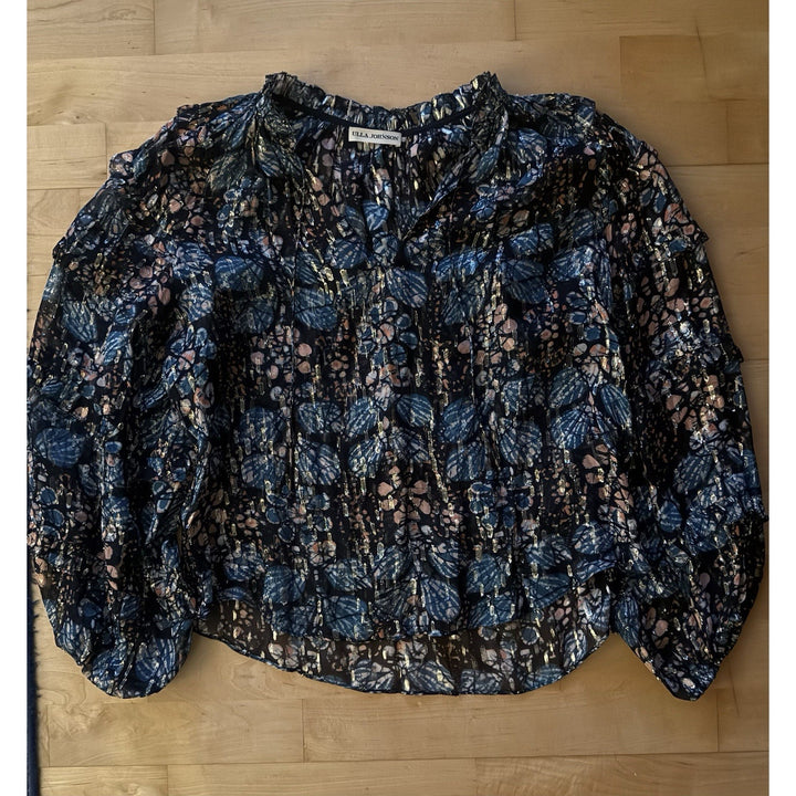 Ulla Johnson Women’s Isadora Sill Lurex Sheer Floral Ruffle Blouse Indigo Blue Size 0