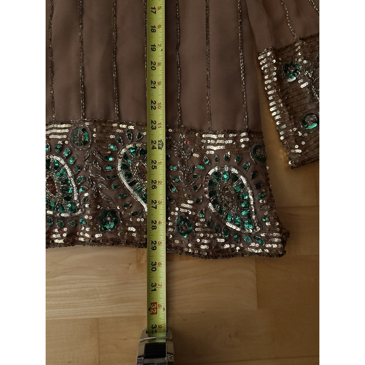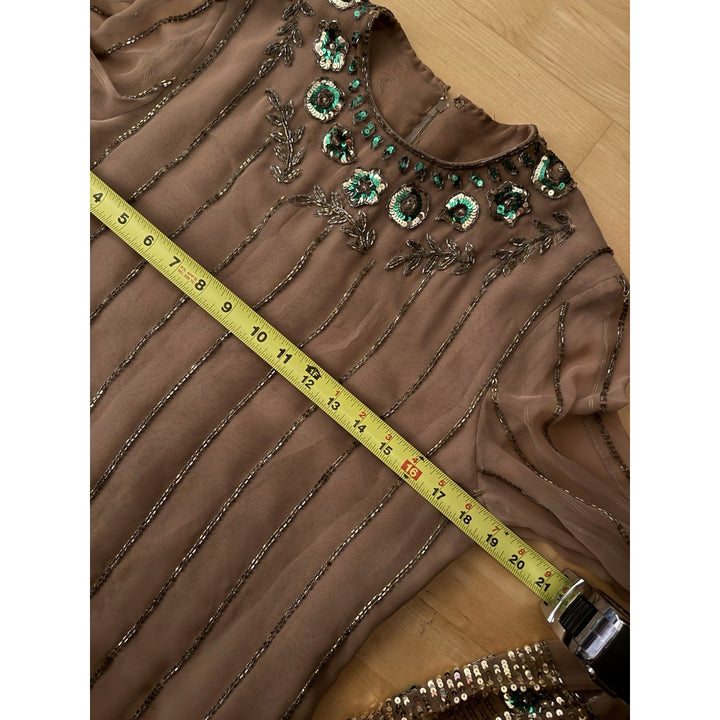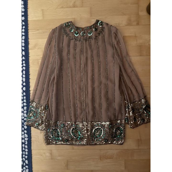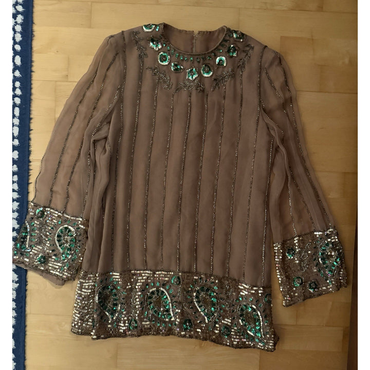 VTG George Allette Tan Sheer Sequin Beaded Tunic Long Sleeve Top Silk 8