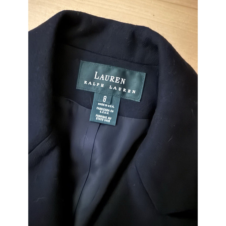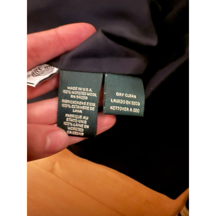 The VTG. Lauren Ralph Lauren Military Sailor Wool Navy Blazer Captain Jacket in size 8 is a vintage women's jacket made from 100% wool with a wool-blend fabric type. This double-breasted military-style jacket features a vented back hem and long sleeves, perfect for winter and spring occasions. With a classic black color and a solid pattern, this jacket embodies a timeless army and 90s theme. Made by Ralph Lauren, this jacket has a regular fit and is a stylish addition to any wardrobe for casual, formal, or workwear looks.