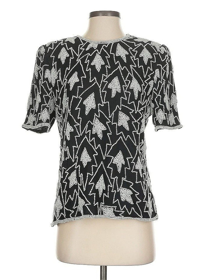 Shine bright in this vintage Laurence Kazar Beaded Silk Top, size Small. With pearl lightning bolt embellishments and intricate beading on luxe black silk, this ‘80s–‘90s gem is perfect for parties, glam nights, or collectors of standout vintage fashion. A dazzling statement piece!