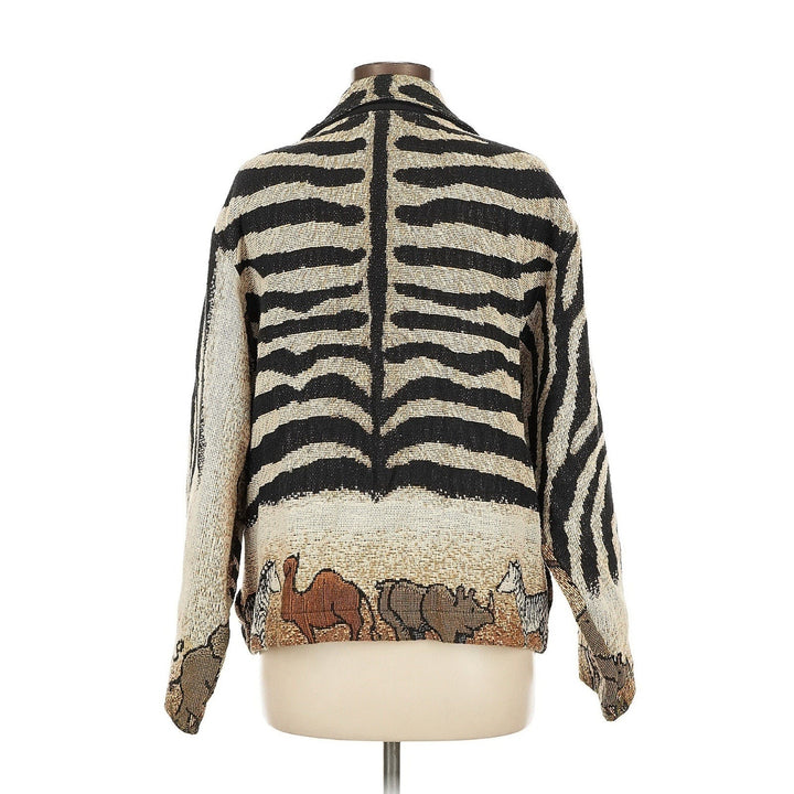 Make a statement with this rare vintage Painted Pony tapestry jacket featuring a vibrant safari scene with zebras, elephants, monkeys, and camels. Crafted in the USA from 100% cotton, this one-size jacket offers a comfortable fit with its mid-length cut, long sleeves, and button-front closure. The bold multicolor animal print design captures the spirit of adventure, making it a unique piece that stands out in any season. Perfect for layering and adding a touch of artistic flair to your wardrobe.