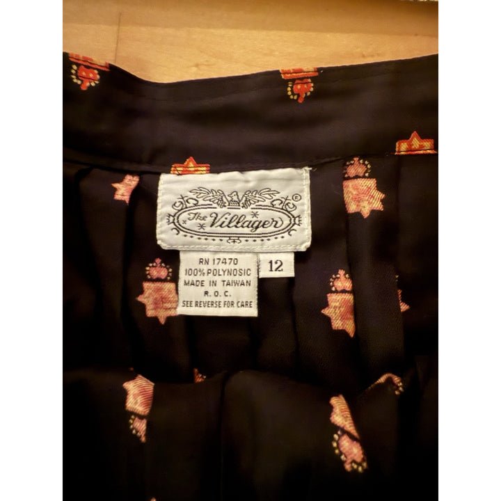 VTG The Villager Women’s Black Crest Block Print Pleated Midi Skirt Size 12