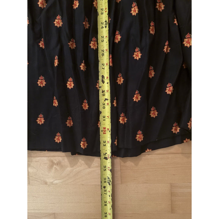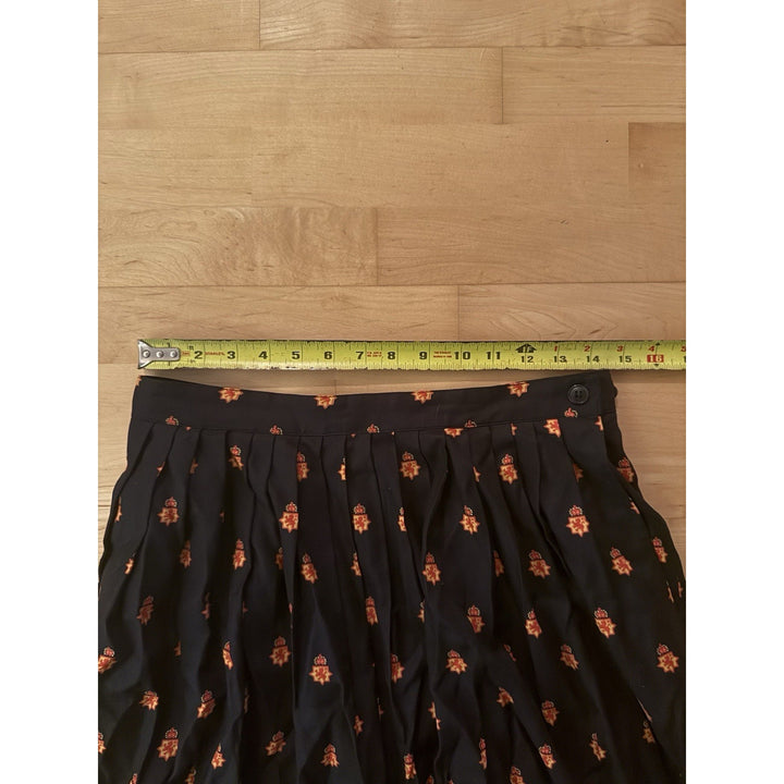 Bring heritage charm to your look with this vintage The Villager Pleated Midi Skirt in black, size 12. Adorned with a crest-inspired block print and classic pleats, this skirt pairs perfectly with blouses or sweaters for timeless vintage-inspired style.