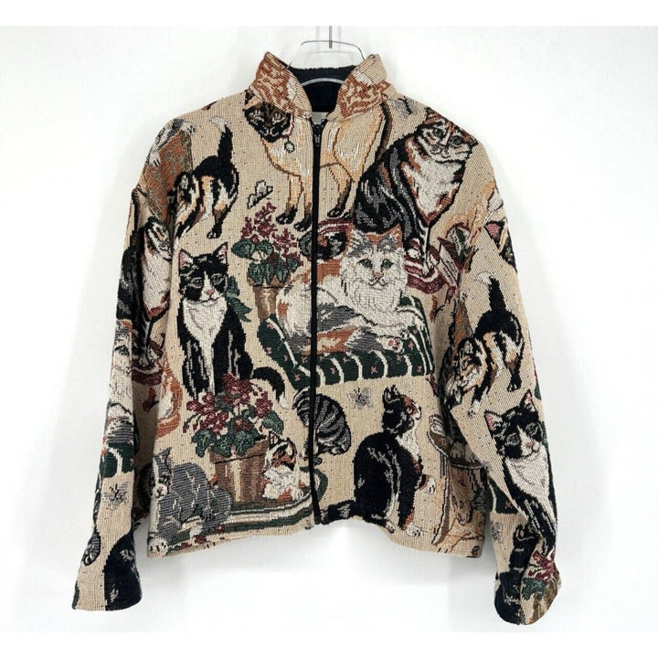 VTG Women's Cat Kitten Tapestry Bomber Jacket Tan Zip-Up OSFA one size