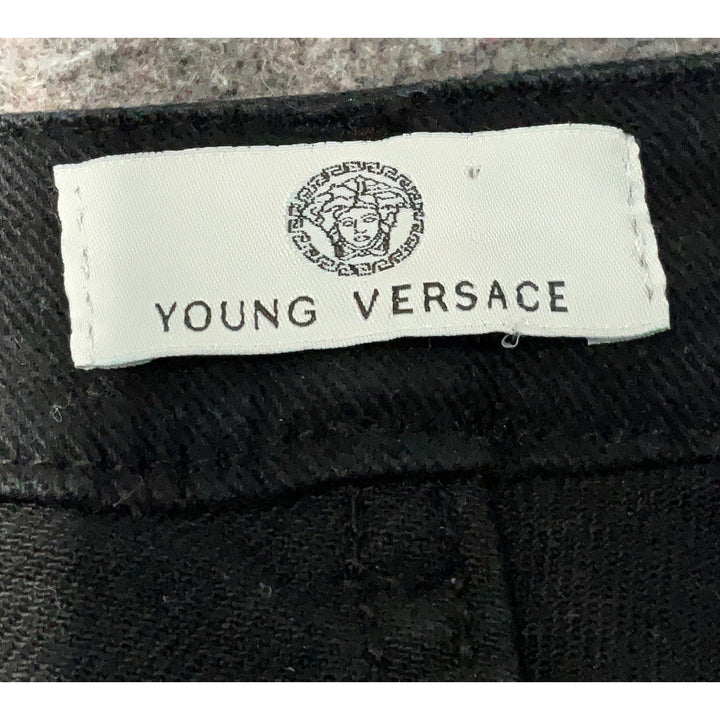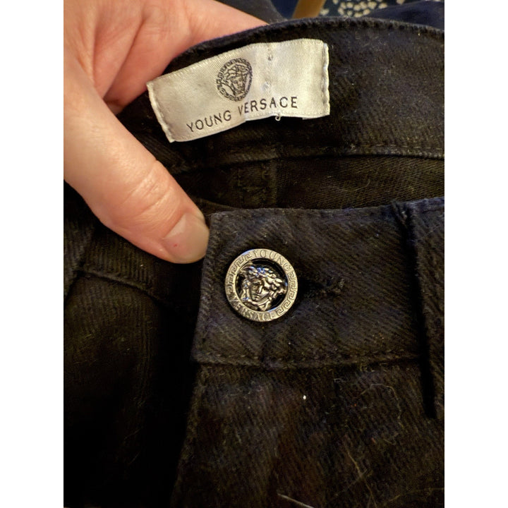 A touch of luxury with everyday ease—these Young Versace straight-leg jeans in black are a versatile wardrobe staple. Made in Italy, they feature high-quality denim, subtle branded detailing, and a clean silhouette. Size 27 waist with a cropped 26.5" inseam, ideal for showcasing bold footwear or a sleek boot.